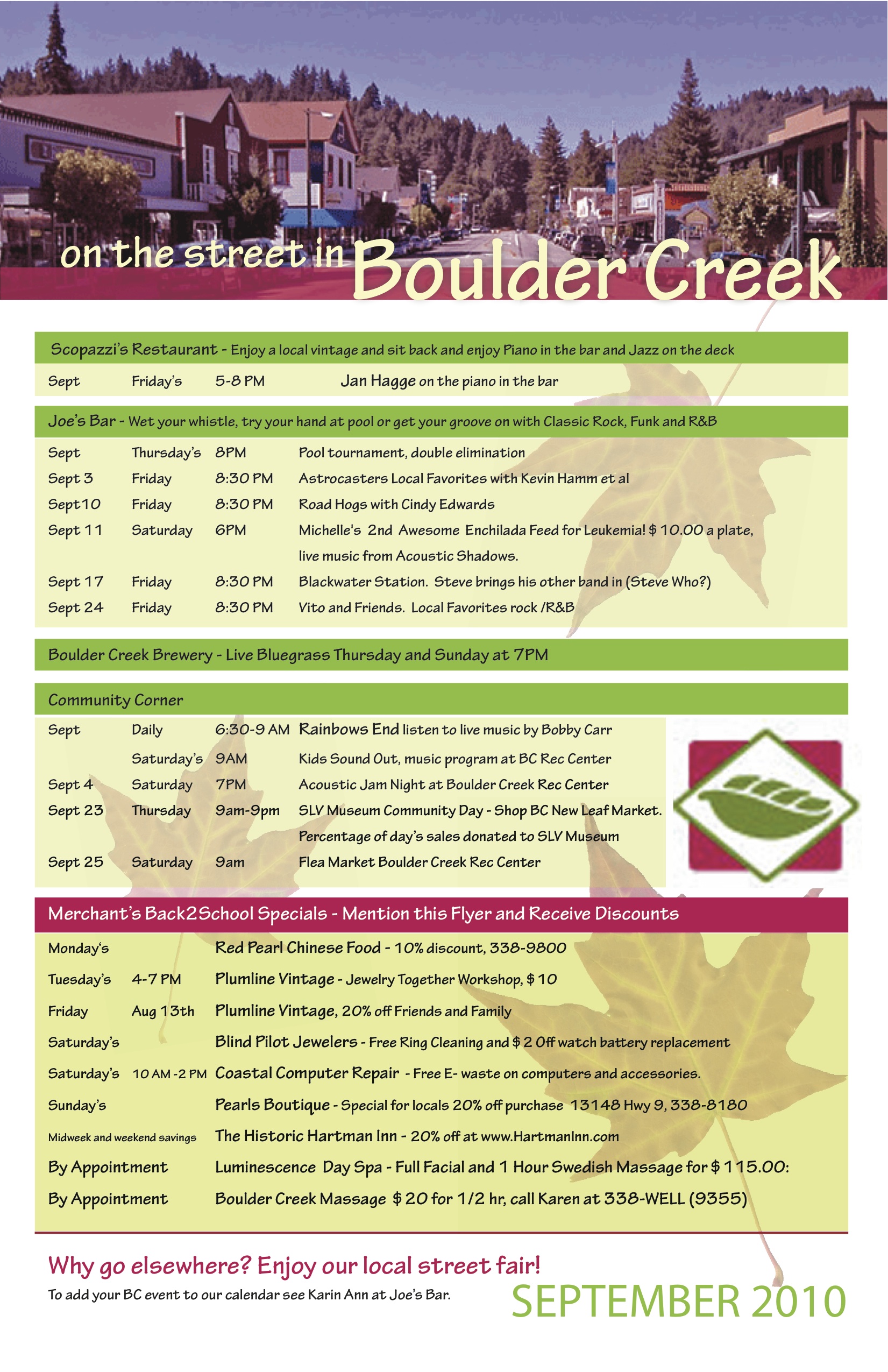 On the Street in Boulder Creek September 10, 2010 By JD in Community, News Leave a comment Click the picture for a BIG view of all of the good things happening in town. Share this: Click to share on X (Opens in new window) X Click to email a link to a friend (Opens in new window) Email Click to share on Facebook (Opens in new window) Facebook Click to share on Pinterest (Opens in new window) Pinterest Click to share on Tumblr (Opens in new window) Tumblr Like Loading... Related