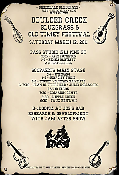 Secret Boulder Creek Bluegrass Festival – THIS SATURDAY March 9, 2011 By JD in Uncategorized Leave a comment Some more info! Share this: Click to share on X (Opens in new window) X Click to email a link to a friend (Opens in new window) Email Click to share on Facebook (Opens in new window) Facebook Click to share on Pinterest (Opens in new window) Pinterest Click to share on Tumblr (Opens in new window) Tumblr Like Loading... Related