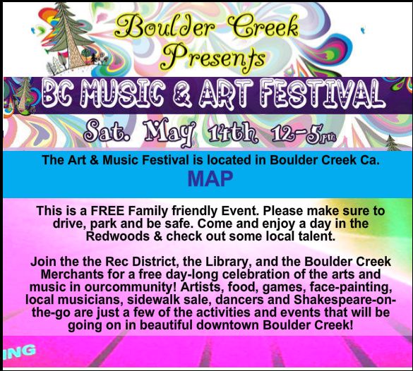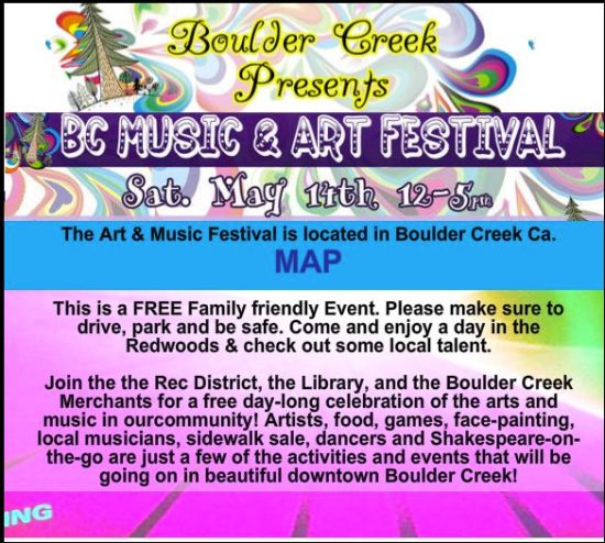 Boulder Creek Music and Art Festival! May 14, 2011 By JD in Uncategorized Leave a comment Share this: Click to share on X (Opens in new window) X Click to email a link to a friend (Opens in new window) Email Click to share on Facebook (Opens in new window) Facebook Click to share on Pinterest (Opens in new window) Pinterest Click to share on Tumblr (Opens in new window) Tumblr Like Loading... Related