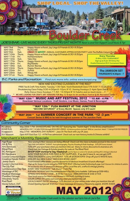 On The Street – May 2012 May 3, 2012 By JD in Uncategorized 1 Comment Click the image for a larger view. There’s a lot going on in Boulder Creek this month! Share this: Click to share on X (Opens in new window) X Click to email a link to a friend (Opens in new window) Email Click to share on Facebook (Opens in new window) Facebook Click to share on Pinterest (Opens in new window) Pinterest Click to share on Tumblr (Opens in new window) Tumblr Like Loading... Related