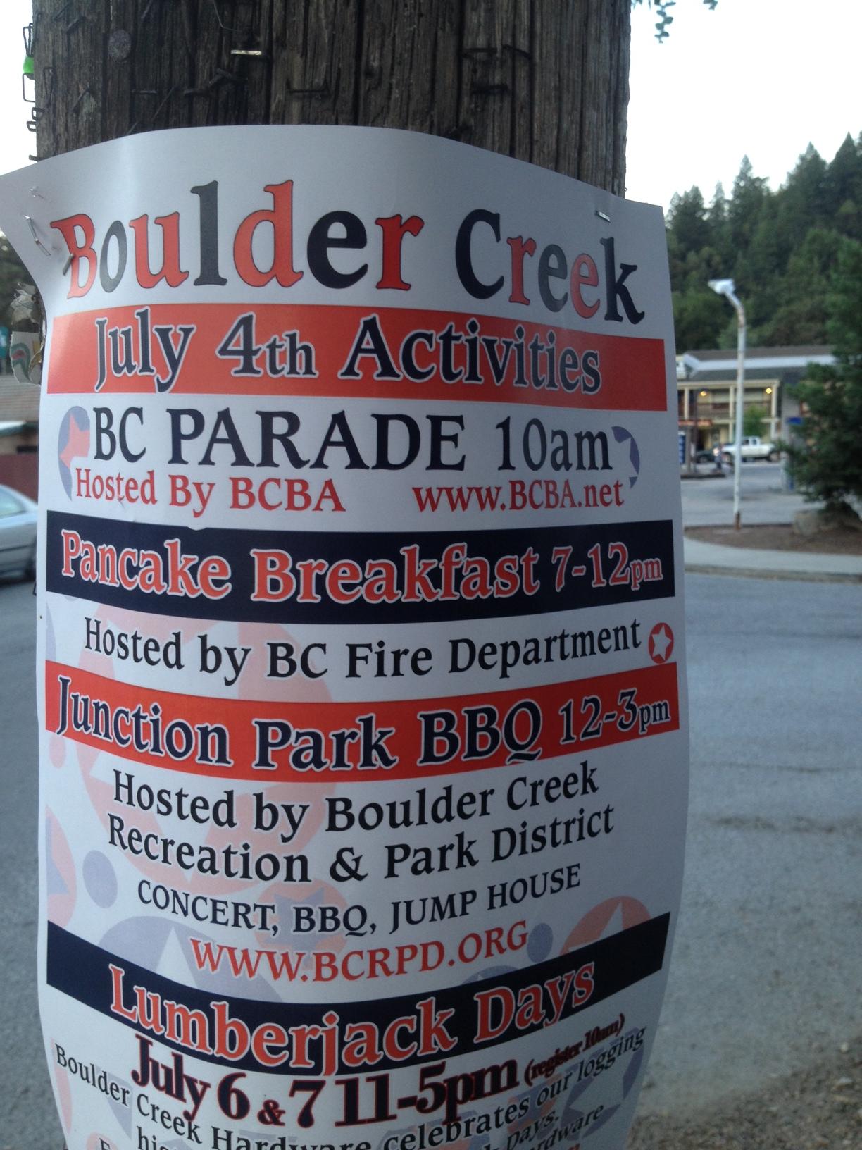 TOMORROW! July 3, 2013 By JD in Uncategorized Leave a comment July 4th in Boulder Creek. Share this: Click to share on X (Opens in new window) X Click to email a link to a friend (Opens in new window) Email Click to share on Facebook (Opens in new window) Facebook Click to share on Pinterest (Opens in new window) Pinterest Click to share on Tumblr (Opens in new window) Tumblr Like Loading... Related
