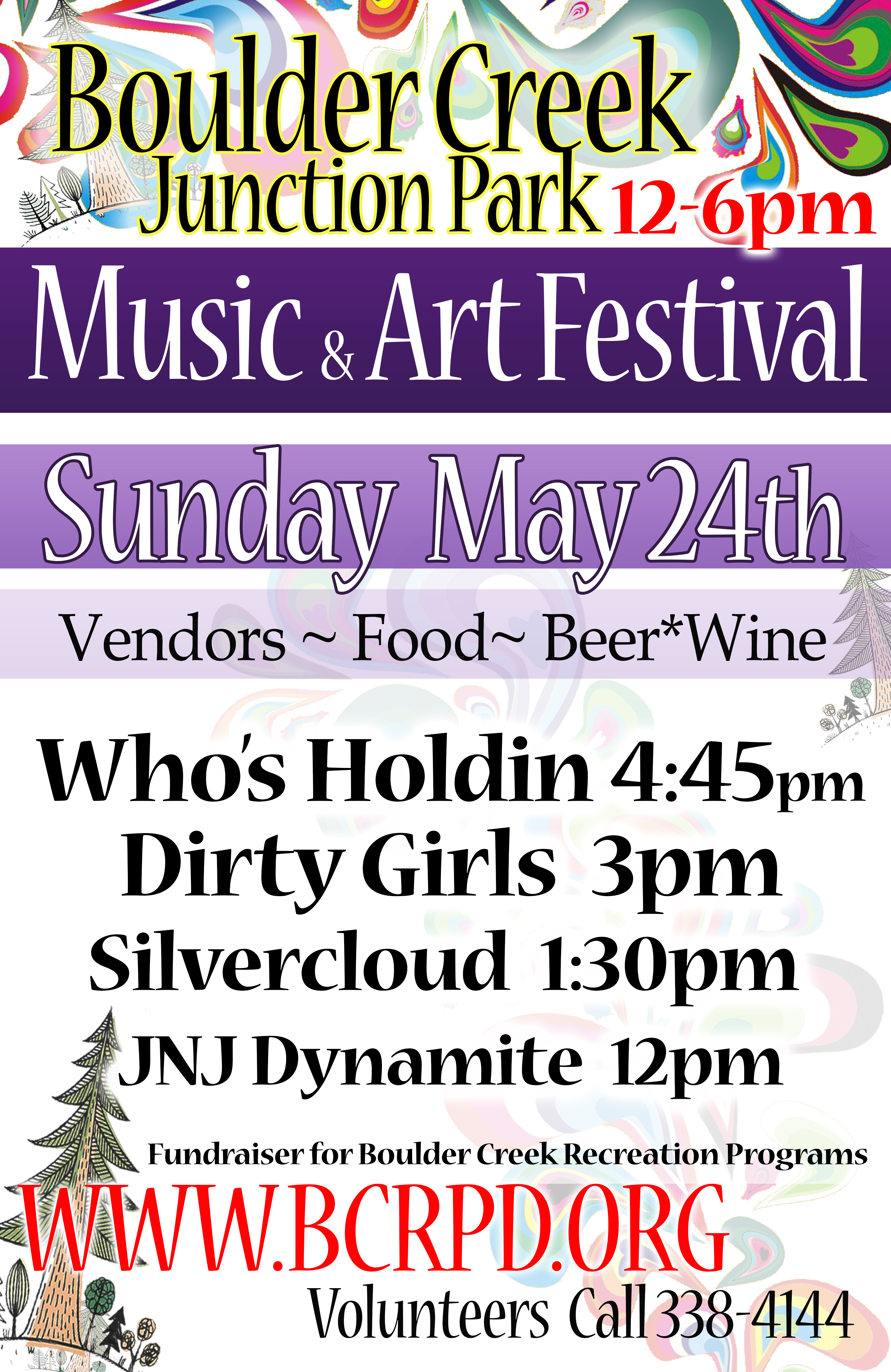 On Sunday May 24th, The Boulder Creek Recreation District will be hosting a fun day at Junction Park. Great bands will be throwing down tunes, Boulder Creek Brewery will be catering the food, there is art to browse and buy and of course cold beer and wine. Come sit on the grass or dip your toes in the river and enjoy this beautiful life in the mountains! Proceeds benefit Boulder Creek Recreation Programs!