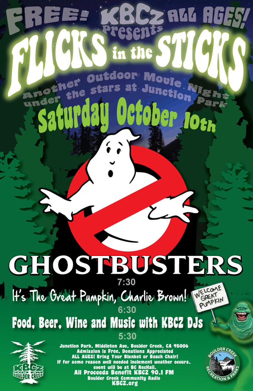Bring Your blanket and beach chairs on Saturday night, October 10th, when Boulder Creek Community Radio, KBCZ presents: “Flicks in the Sticks” an outdoor movie night at Junction Park showing, It’s the Great Pumpkin, Charlie Brown! at 6:30 and then Ghostbusters at 7:30. Ghostbusters is recommended for ages 10 and up. There will be food, drinks and music with DJ SamtheRam at 5:30. Admission is Free, though donations are greatly appreciated. KBCZ is currently on the air at 90.1 FM and can be heard all over Boulder Creek playing local artists as well as established artists. All proceeds from this movie night benefit KBCZ, Boulder Creek Community Radio who is currently raising funds for it’s Emergency Alert System (EAS). Questions or comments, please contact KBCZ.org