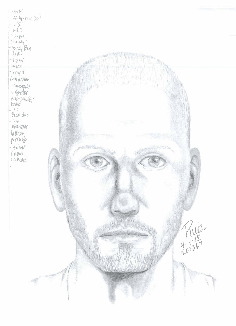The victim described the suspect as a white male, in his 30’s, 6’00”, thin build, a bump on his nose, light brown or blond hair, with scruff along his jaw line and a goatee. He was wearing blue jeans and a white tank top. The victim had never seen the suspect before.