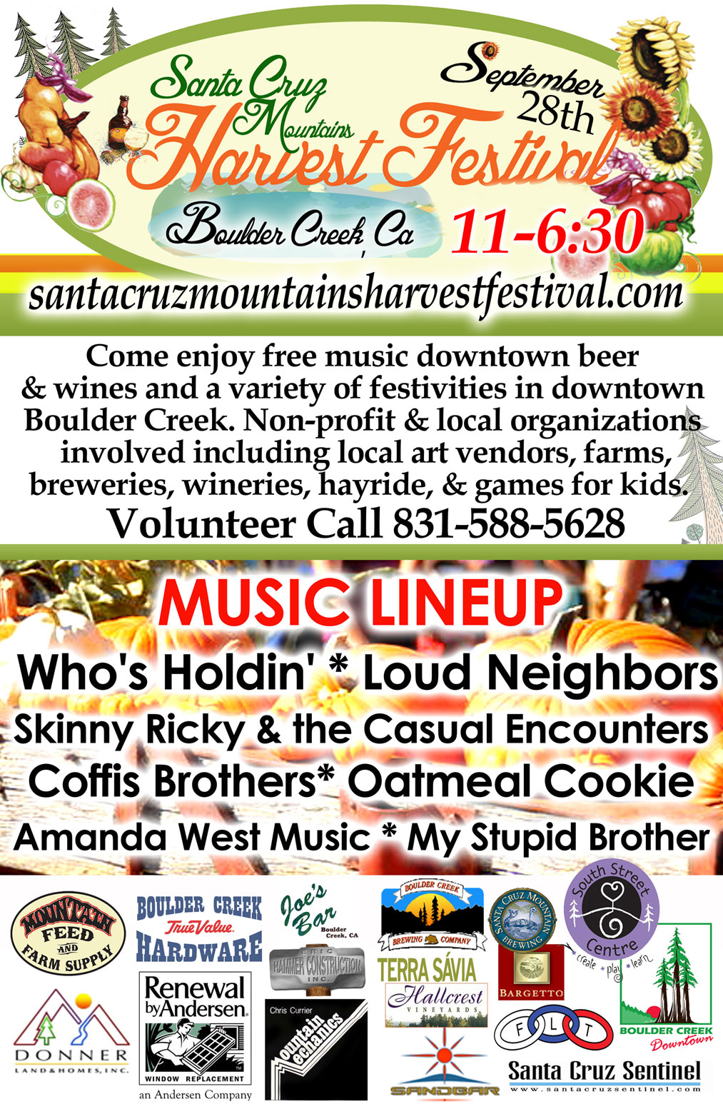 Two stages will be set up for musicians at Junction Park and outside Joe’s Bar and Boulder Creek Hardware. A kids’ pass for activities is $10. Beer or wine will be $6 glass or $15 for a Harvest Festival glass and one drink.