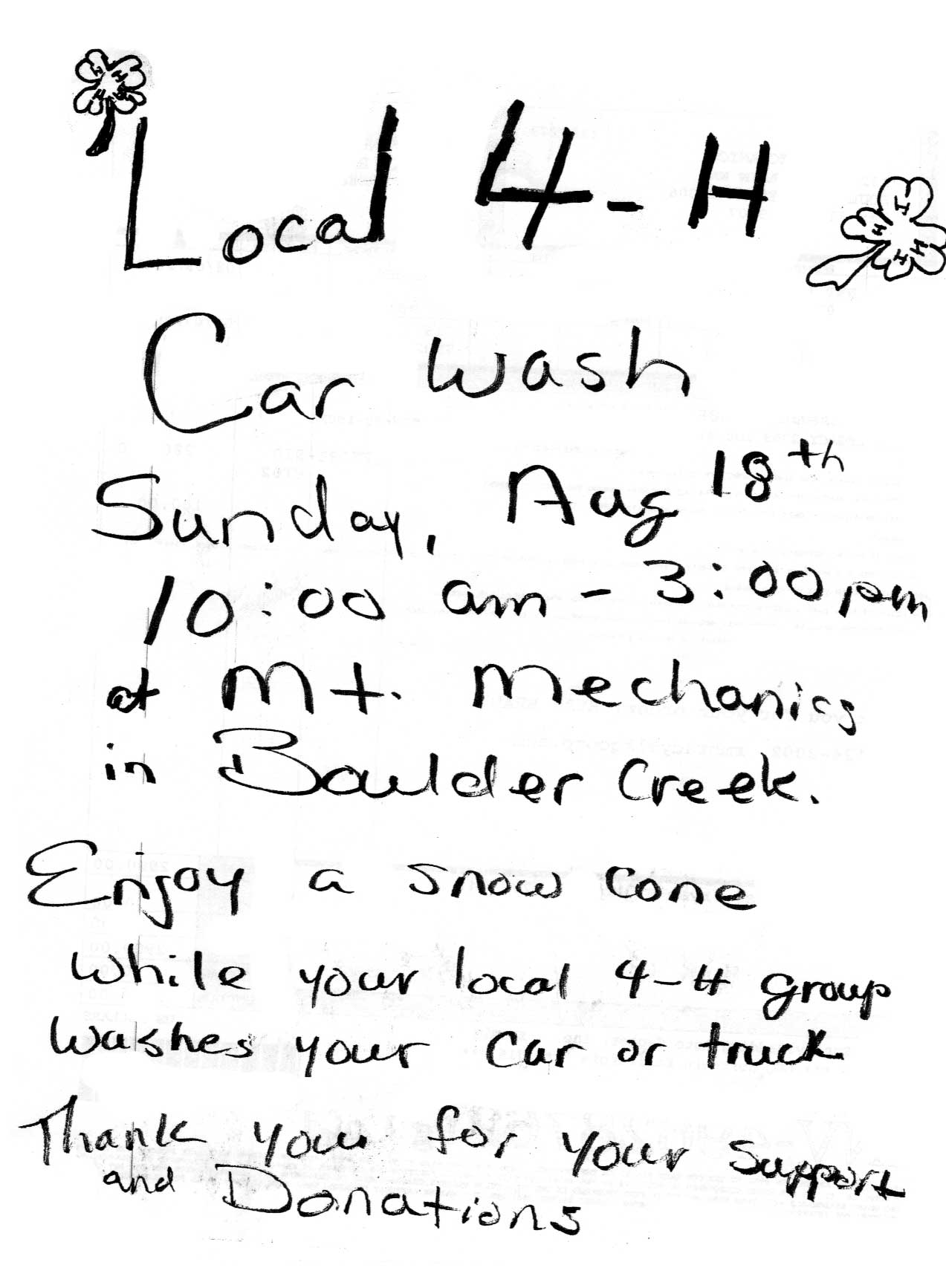 Car Wash with Snow Cones . . this Sunday August 16, 2013 By JD in Community, events, town pride Tags: 4-H carwash, boulder creek carwash, Cars, mt. mechanics, snow cone 2 Comments Come get your car clean, enjoy a snow cone and support our local 4-H this Sunday at Mt. Mechanics…. Share this: Click to share on X (Opens in new window) X Click to email a link to a friend (Opens in new window) Email Click to share on Facebook (Opens in new window) Facebook Click to share on Pinterest (Opens in new window) Pinterest Click to share on Tumblr (Opens in new window) Tumblr Like Loading...