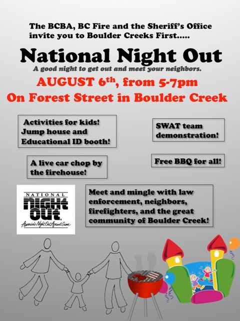 This Tuesday the Boulder Creek Business Association will be hosting National Night Out on Forest St. between the hours of 5:30 pm- 7:30pm. There will be demonstrations by the Santa Cruz County Sheriff and Boulder Creek Fire Dept. and activities for all ages, as well as free community BBQ, and bounce house.