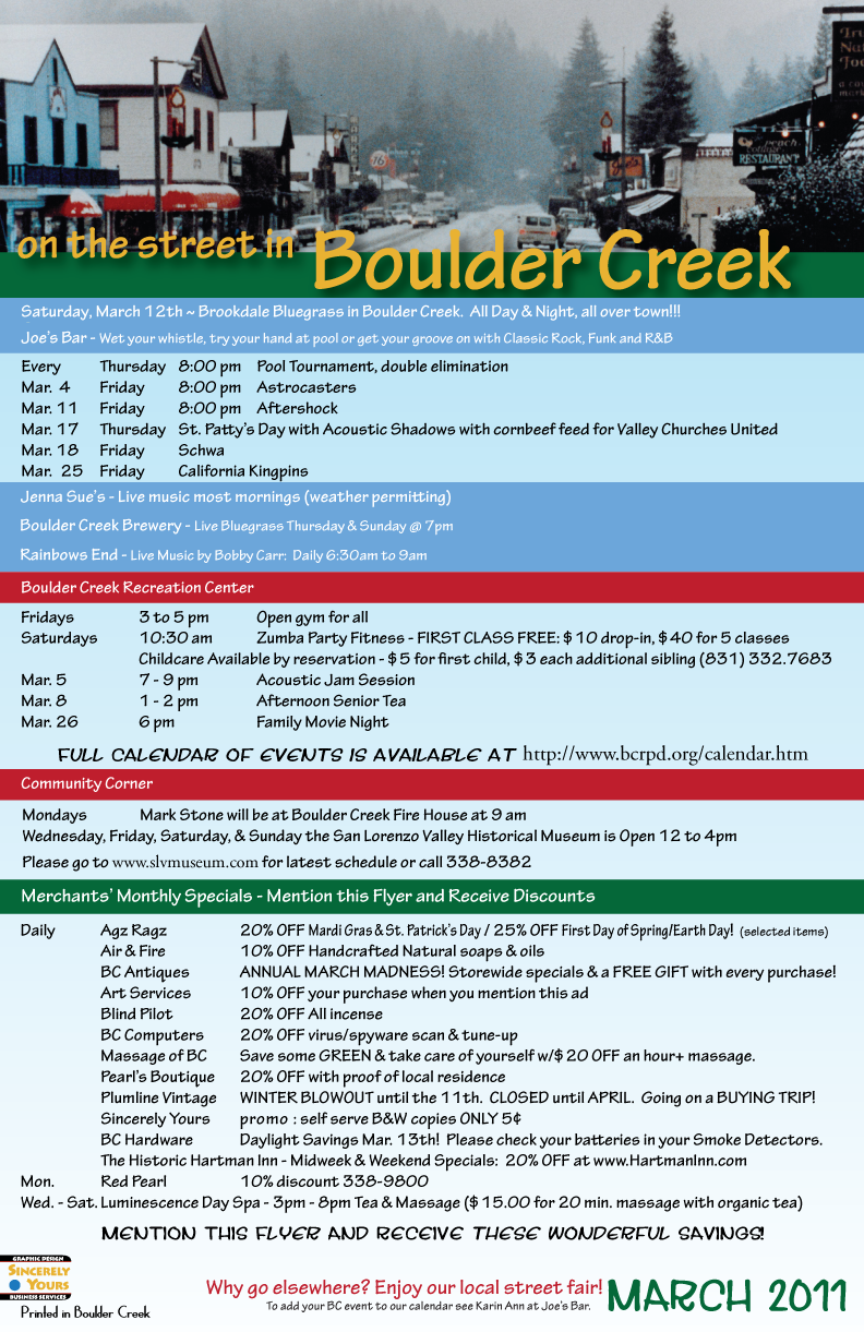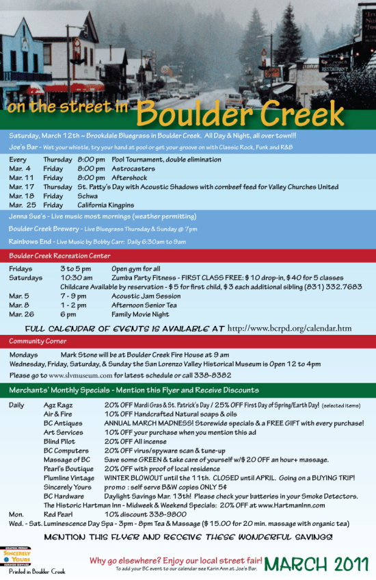 Boulder Creek Happenings – June 2011 June 3, 2011 By JD in music, Stores and Shops Tags: on the street Leave a comment Share this: Click to share on X (Opens in new window) X Click to email a link to a friend (Opens in new window) Email Click to share on Facebook (Opens in new window) Facebook Click to share on Pinterest (Opens in new window) Pinterest Click to share on Tumblr (Opens in new window) Tumblr Like Loading...
