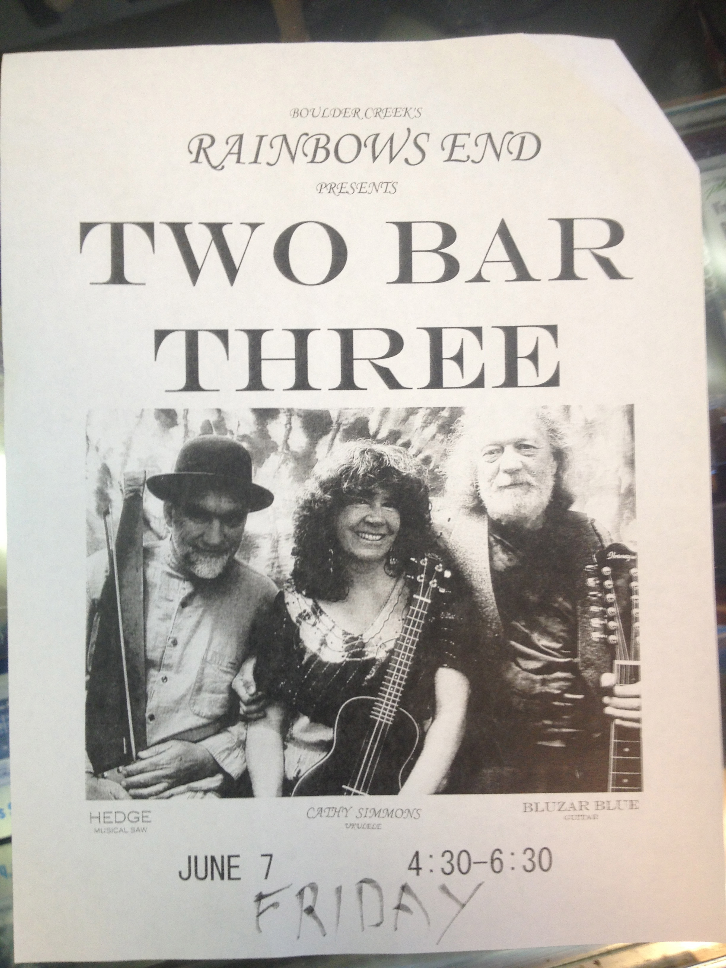 Music today at 4:30 – Two Bar Three May 10, 2013 By JD in events, music Tags: entertainment, music, rainbow's end, two bar three 1 Comment Ever wondered what a musical saw, ukulele and guitar would sound like together? Well head over to the Rainbow’s End today at 4:30 and check out Two Bar Three. Share this: Click to share on X (Opens in new window) X Click to email a link to a friend (Opens in new window) Email Click to share on Facebook (Opens in new window) Facebook Click to share on Pinterest (Opens in new window) Pinterest Click to share on Tumblr (Opens in new window) Tumblr Like Loading...